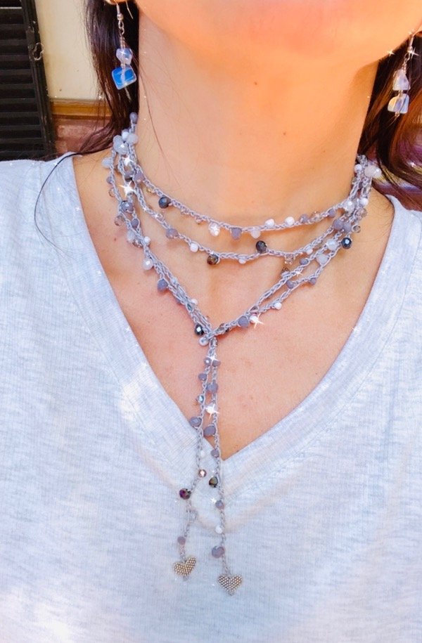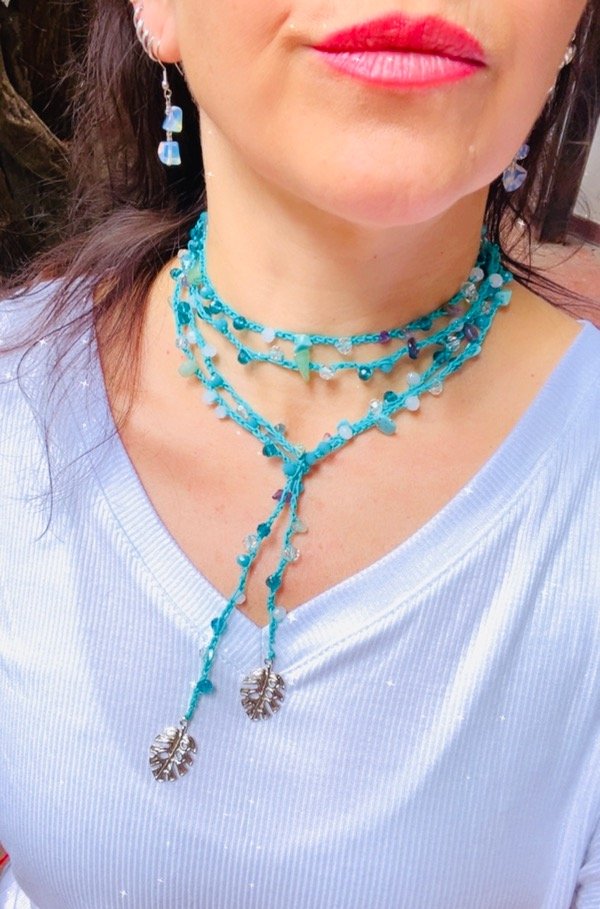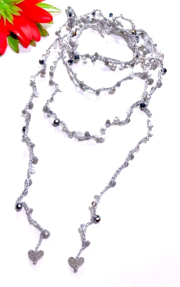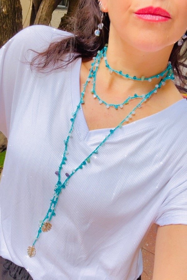 Hermoso collar tejido a mano con hilo de primera calidad, este tiene un largo de 2metros aprox. es súper versátil, usarlo largo, como gargantilla y también como pulsera.