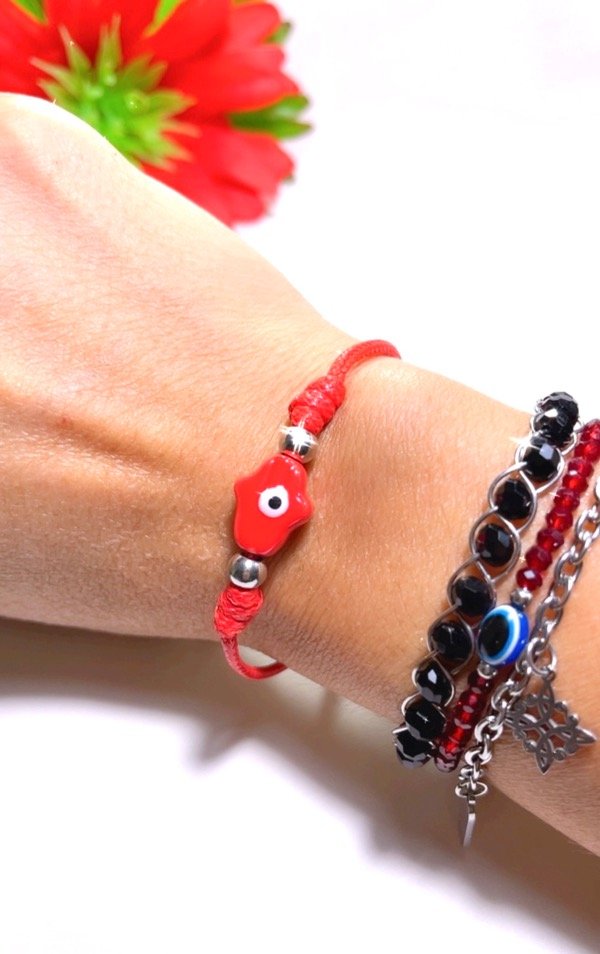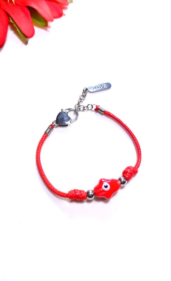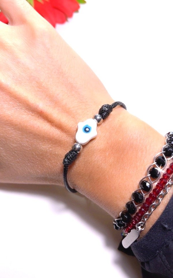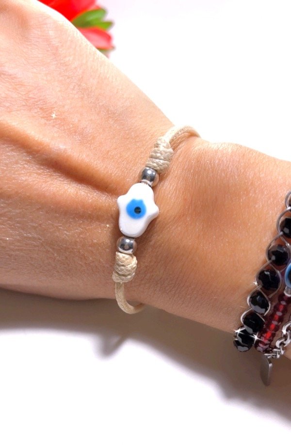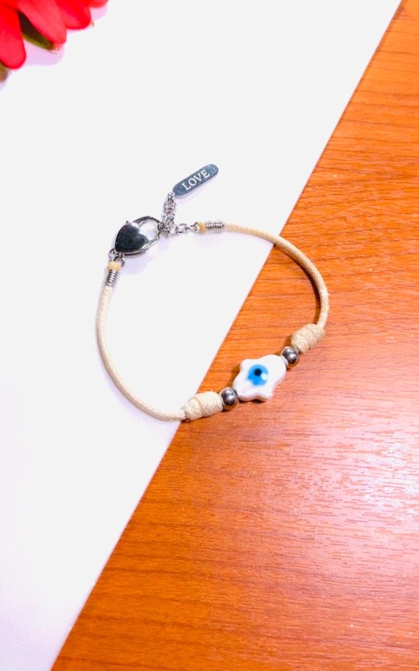 Pulsera hecha a mano con un hermoso cordón q simula al cuero, dije de cerámica y terminales de acero.