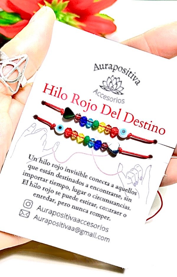 Pulsera roja hecha a mano con hilo chino súper resistente, ojito de vidrio, cristales q forman los chakras y un corazón de hematites.
