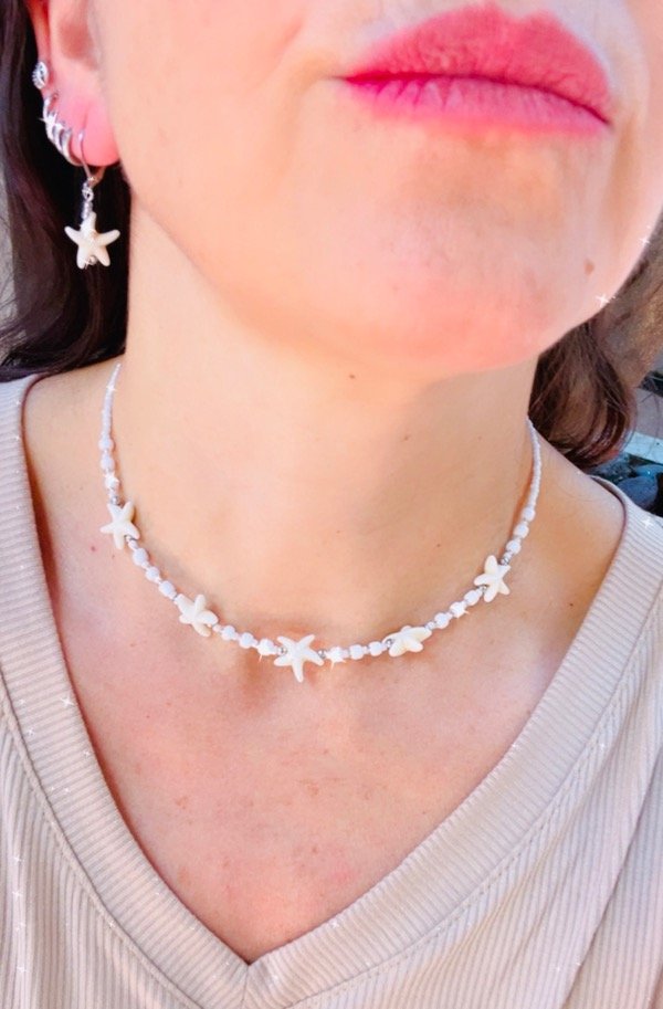 Collar hechos a mano de 40cm y 5cm de cadena de extencion , con mostacillas y estrella , apto al agua!