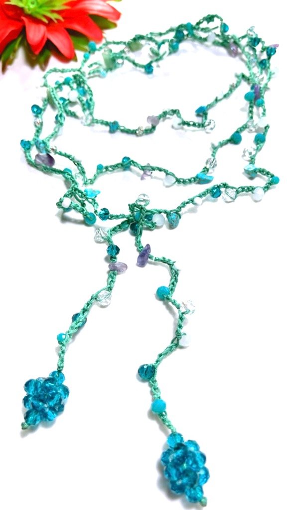 Hermoso collar tejido a mano con hilo de primera calidad, este tiene un largo de 2metros aprox. es súper versátil, usarlo largo, como gargantilla y también como pulsera.