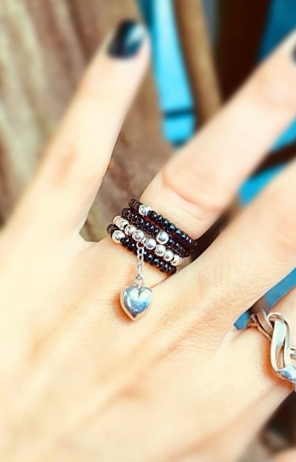 Anillos elásticos hechos a mano, uno hecho todo de bolitas de plata de 3mm y tres hechos de mostacillas negras y una bolita de plata cada uno.